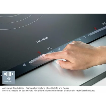 La placa de inducción Siemens EX275FXB1E es un modelo para instalación integrada con superficie vitrocerámica y control táctil touchSlider. Incorpora