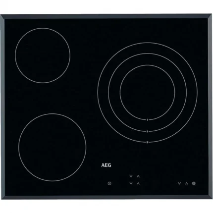 La placa vitrocerámica AEG HK623020FB es un modelo encastrable de 60 cm con 3 zonas de cocción eléctricas sobre superficie
