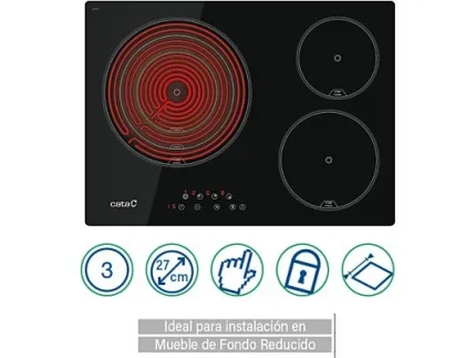 La Cata TT 5003/G es una placa vitrocerámica eléctrica de encastre con 3 zonas de cocción y ancho de 60