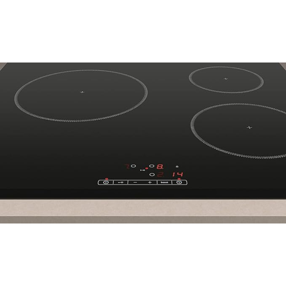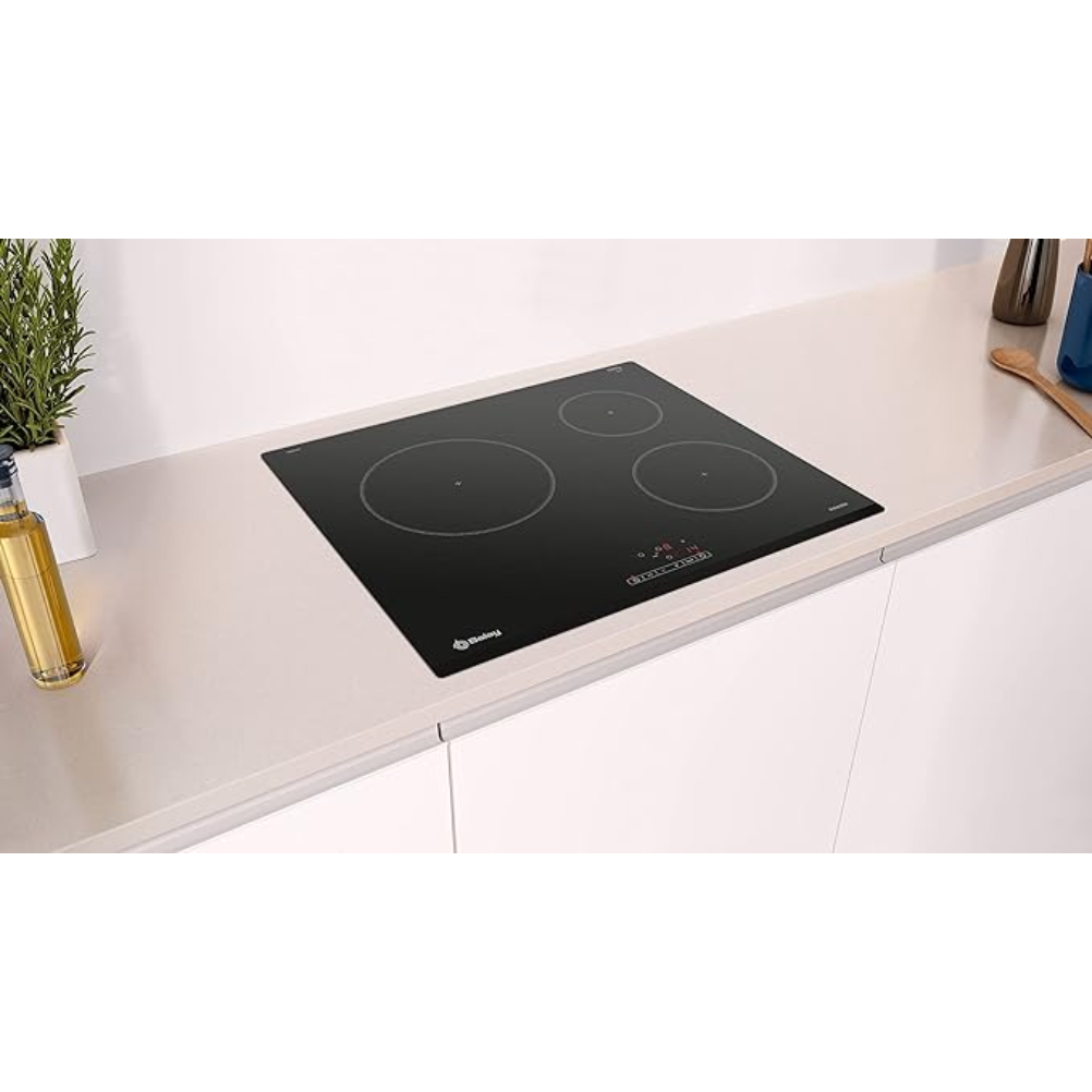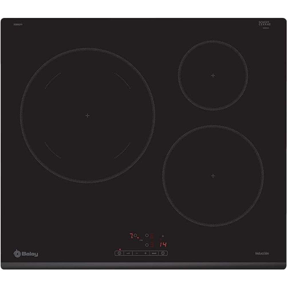 La placa de inducción Balay 3EB865FR es un modelo de encastre con superficie de vidrio vitrocerámico y tres zonas de cocción por inducción. Dispone de control táctil frontal, 17 niveles de cocción y función Sprint. Incluye programación del tiempo de cocción para cada zona, temporizador con avisador acústico, bloqueo para niños, indicador de calor residual de dos niveles y desconexión automática. El panel táctil permite seleccionar el nivel de cocción y gestionar las funciones de cada zona. Instalación integrada en encimera y alimentación eléctrica. Referencia del fabricante: 3EB865FR.