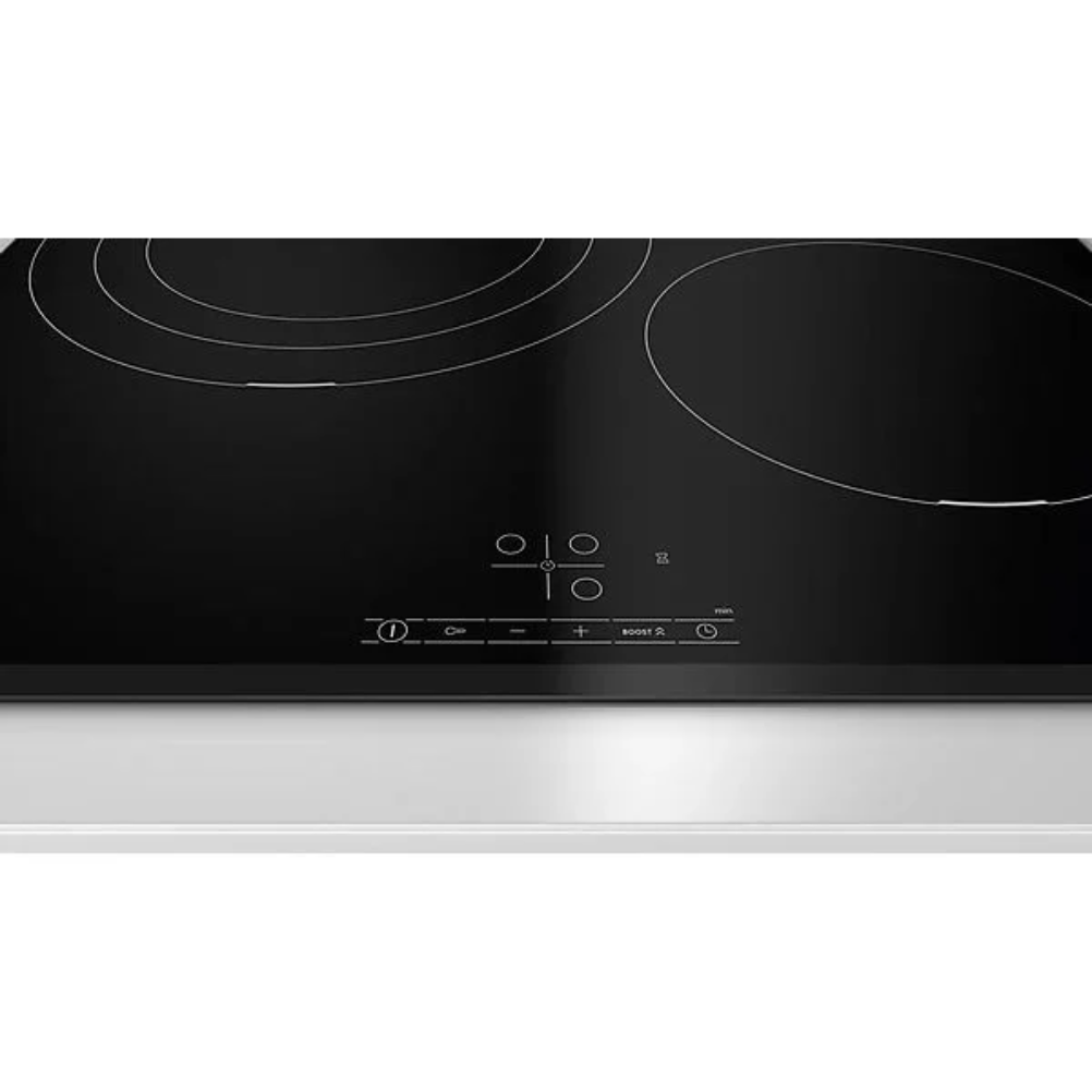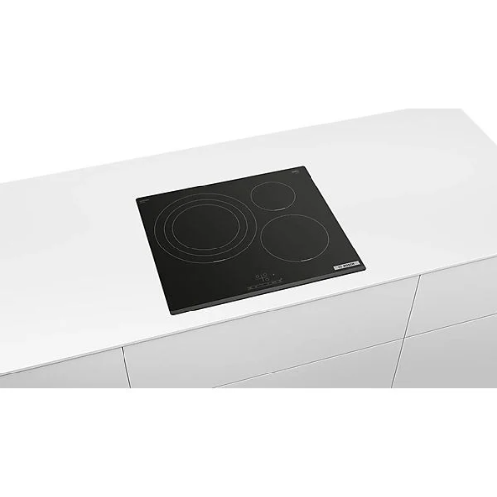 La placa de inducción Bosch PID631BB5E es un modelo de encastre de 60 cm con superficie vitrocerámica y 3 zonas de cocción por inducción. Incorpora control TouchSelect para seleccionar la zona y el nivel de potencia, con 17 niveles de cocción. Incluye función PowerBoost, función QuickStart y función ReStart. Dispone de temporizador, función de desconexión para la zona seleccionada y aviso acústico al finalizar el tiempo programado. El panel de mandos está situado en la parte frontal de la placa. También integra indicadores de calor residual, reconocimiento de recipiente, bloqueo del panel de control y desconexión automática. Funciona mediante conexión eléctrica y está destinada a instalación integrada en encimera.