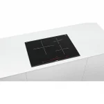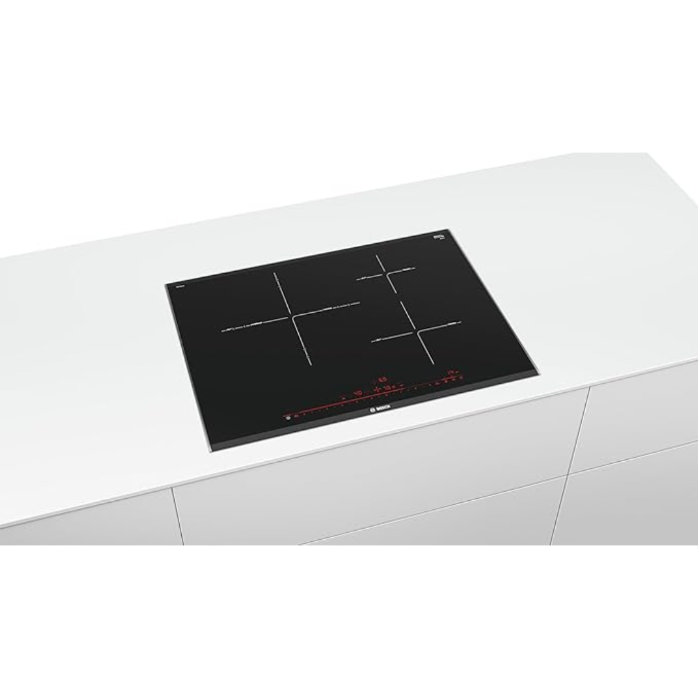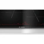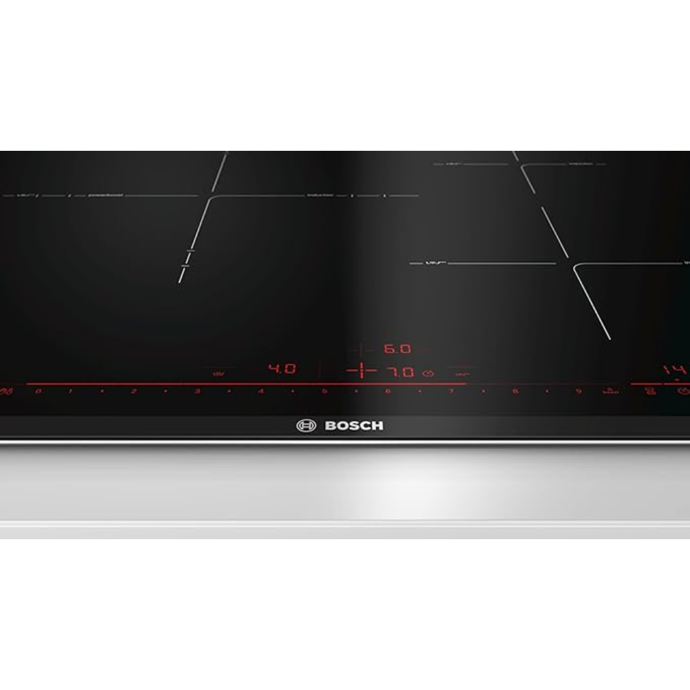 La Bosch PID775DC1E es una placa de inducción encastrable con superficie de vidrio vitrocerámico y 3 zonas de cocción. Incorpora control táctil DirectSelect con selección directa de niveles, 17 niveles de potencia y función PowerBoost en las zonas compatibles. Incluye una zona de 32 cm, detección de recipiente y temporizador de desconexión para cada zona, además de avisador acústico independiente. Integra sensor de fritura con 5 niveles de temperatura, función QuickStart para detección al colocar el recipiente y función ReStart para recuperar la configuración anterior tras una desconexión. Dispone de bloqueo del panel, bloqueo para niños, indicador de calor residual de 2 niveles, desconexión automática y gestión de potencia. La potencia total conectada es de 7,4 kW. El equipo está destinado a instalación sobre encimera y funcionamiento mediante conexión eléctrica.
