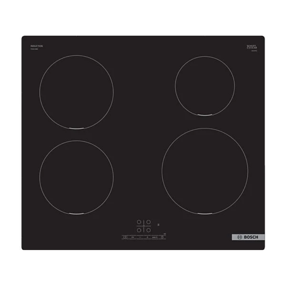 La Bosch PUE611BB5E es una placa de inducción de 60 cm con 4 zonas de cocción y control TouchSelect. Dispone de 17 niveles de potencia y función PowerBoost. La distribución de zonas es la siguiente: delantera izquierda de 180 mm con 1,8 kW, trasera izquierda de 180 mm con 1,8 kW, trasera derecha de 145 mm con 1,4 kW y delantera derecha de 210 mm con 2,2 kW. Con PowerBoost, la potencia máxima alcanza 3,1 kW en cada zona de 180 mm, 2,2 kW en la zona de 145 mm y 3,7 kW en la zona de 210 mm. Incorpora temporizador, función QuickStart, función ReStart, detección de recipientes, indicador de calor residual de 2 niveles, bloqueo para niños y desconexión automática. Medidas del aparato: 51 x 592 x 522 mm. Medidas de encastre: 560 x 490-500 mm.
